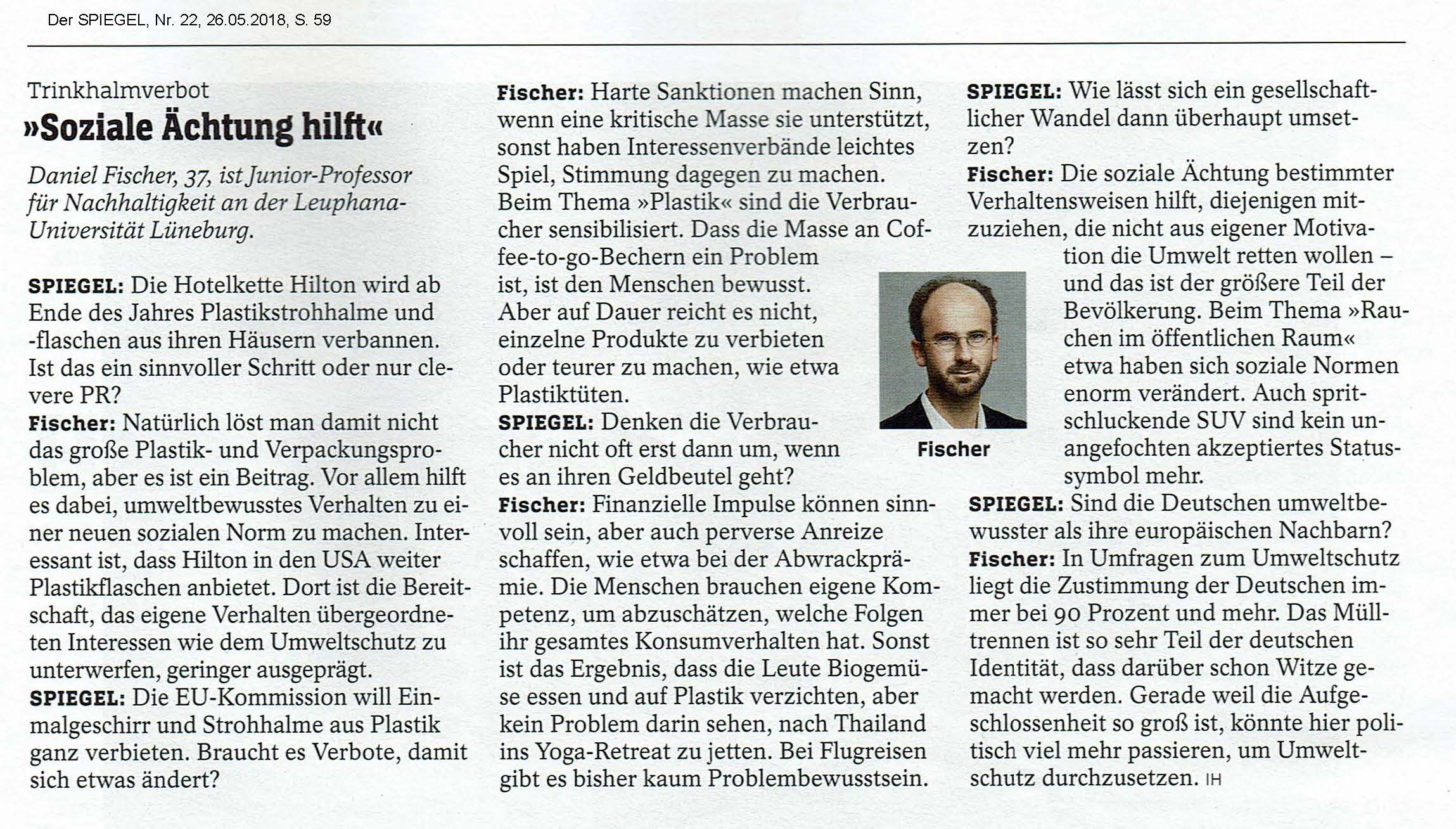 - May 26, 2018: “Social ostracism helps”. In: Der SPIEGEL. The interview [in German] with Daniel Fischer on social change can be found here.